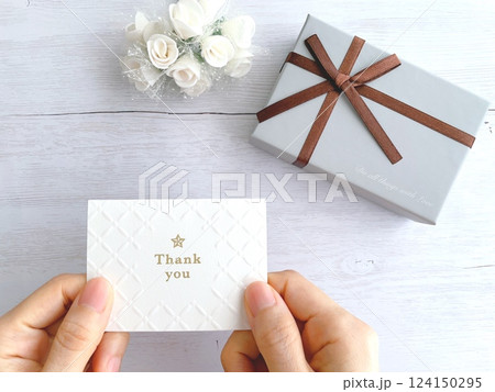 サンキューのメッセージカードを持つ手とプレゼント