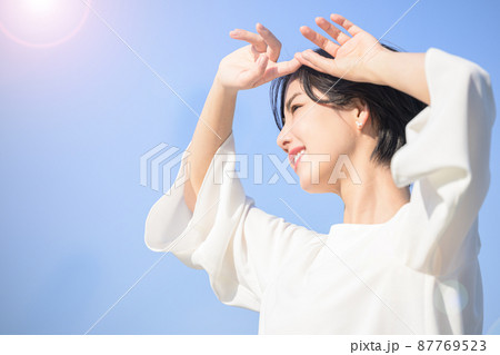 日光浴 日差しがまぶしい女性