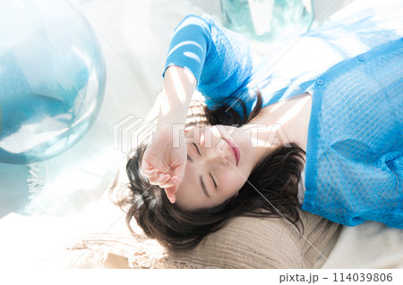 眩しい夏の日差しで寝転がる目を閉じる美しい女性 海や夏の日焼けやUVの美容イメージなどにも 俯瞰