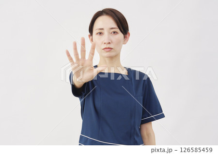 女性 美容看護師 制止のジェスチャー 白背景