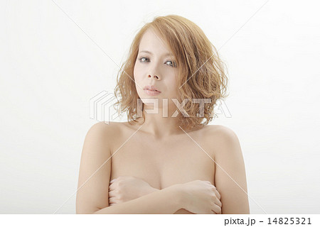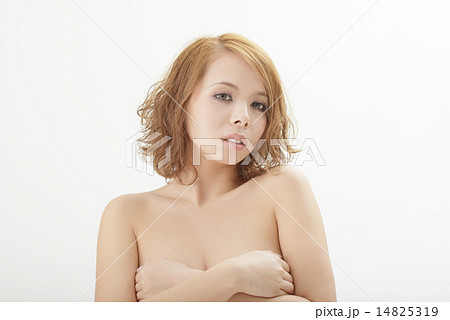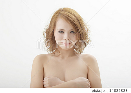 胸を手で隠す女性の写真。手ブラのイメージ。