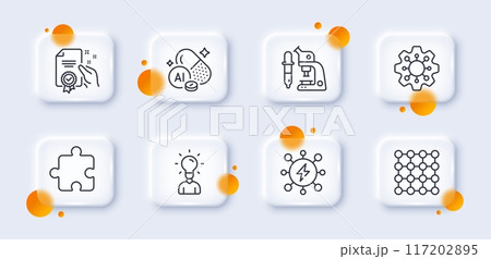 Density, Microscope and Education line icons pack. 3d glass buttons with blurred circles. Power, Puzzle, Execute web icon. Certificate, Aluminium mineral pictogram. For web app, printing. Vector