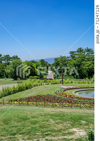大阪服部緑地・円形花壇から西中央広場方向を臨む、六甲の山並みの見える青空の広がる園内の風景