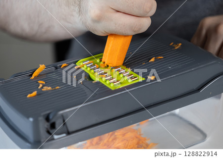 A person's hand skillfully shreds a vibrant orange carrot using a modern kitchen grater, preparing fresh ingredients for healthy meal preparation and home cooking