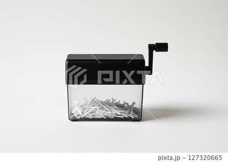 白い背景に置かれたシンプルな黒いハンドシュレッダー