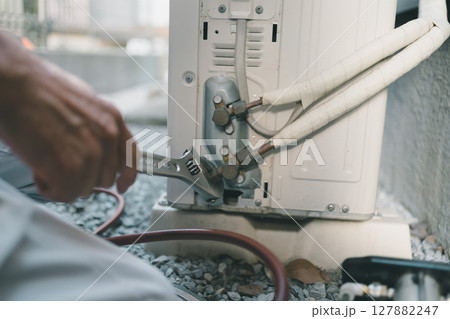 ルームエアコン室外機 手動式真空ポンプ エアパージ