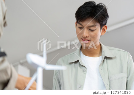 Young Architect Engaged in Project. A student observing a wind turbine model with interest.
