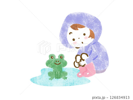水たまりにいるカエルをじっと見つめるカッパを着た女の子のイラスト
