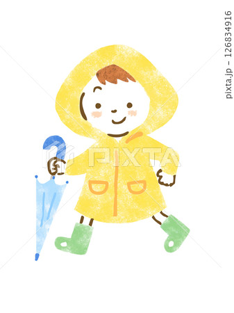 閉じた傘を持ってカッパを着て歩いている男の子のイラスト