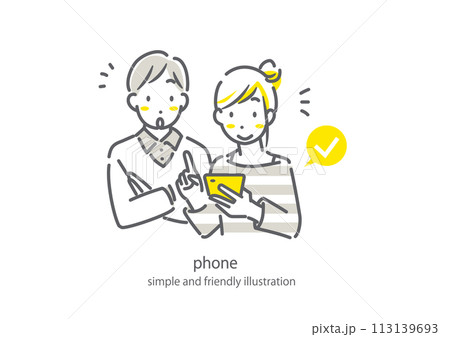 スマホで手続きをする若い夫婦 シンプルでお洒落な線画イラスト