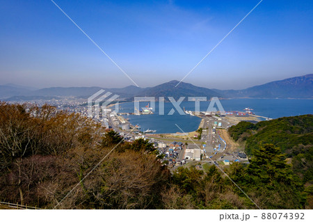 福井県敦賀市金ヶ崎城跡 月見御殿から見るつるがセメントと敦賀火力発電所