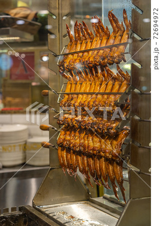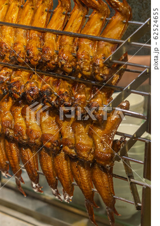 Roasted chicken wings hanging on grilling machine at Chinese restaurant