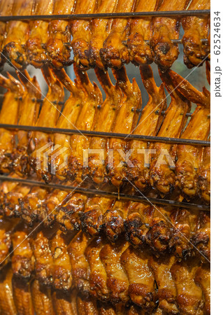 Spicy roasted chicken wings hang in rows in Chinese restaurant