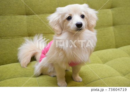 避妊・去勢手術後ウェアを着ている子犬 ミックス犬 ポメックス
