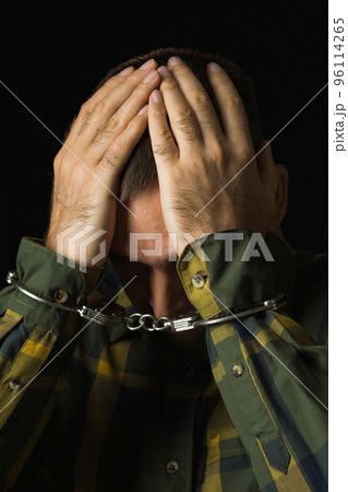 Man detained in handcuffs. Prisoner or arrested man in handcuffs