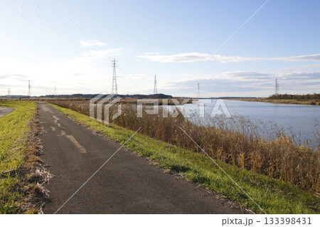 初夏の澄んだ青空の下を自転車で走る親子(手賀沼サイクリングロード)