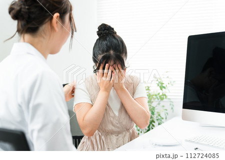 深刻な病気の女性を診察する医者・医師・ドクター(鬱病・精神疾患・流産)
