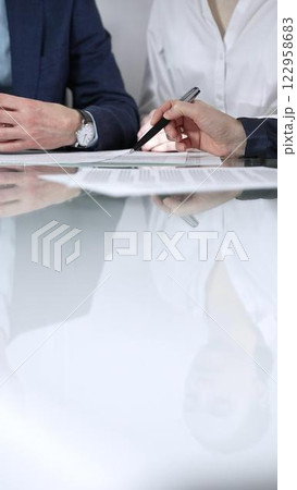 Unrecognizable business people are reviewing contract terms during a meeting while sitting at the glass table in office, vertical close up view. Copy space area
