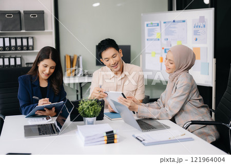Entrepreneurs and business people conference in modern meeting room, happy multiracial coworkers have fun cooperating working together at office meeting, asian teamwork concept
