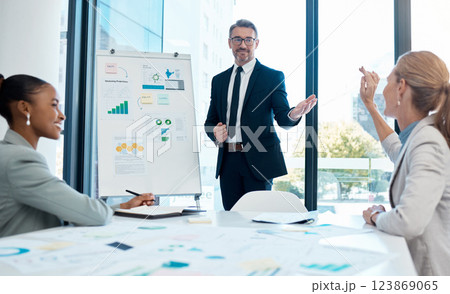 Strategy, planning and sales chart presentation, idea sharing in corporate brainstorming workshop at startup. Teamwork, leadership and CEO man and women in business growth meeting in office boardroom