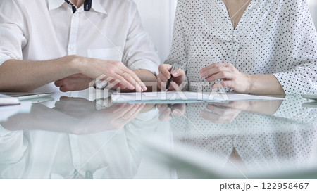 Business colleagues reviewing a contract, engaging in negotiations and strategic decision making in modern glass office, white casual dress style. Businesspeople concept