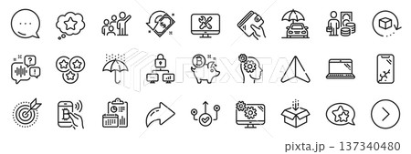 Wallet, Return package and Voicemail line icons pack. Share, Message, Paper plane icons. Laptop, Stars, Forward web icon. Report, Get box, Star pictogram. Vector