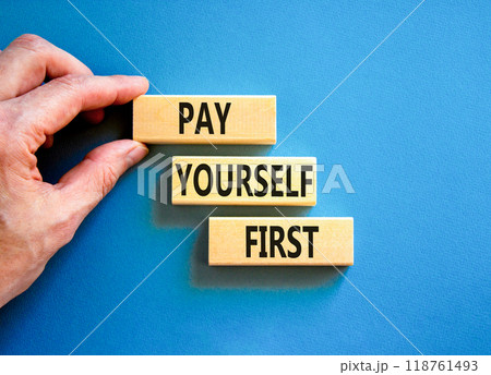 Pay yourself first symbol. Concept words Pay yourself first on beautiful wooden blocks. Beautiful blue table blue background. Businessman hand. Business and pay yourself first concept. Copy space.