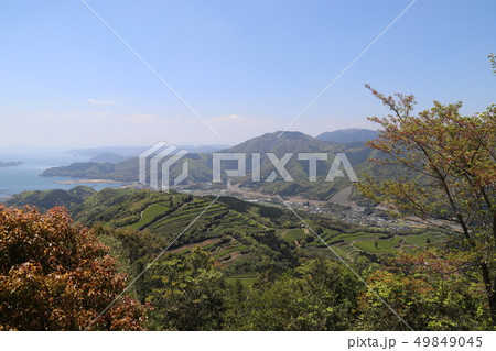 宮崎県延岡市の日向灘の海を背景に日本の里100選に選ばれた風景、地下の茶山