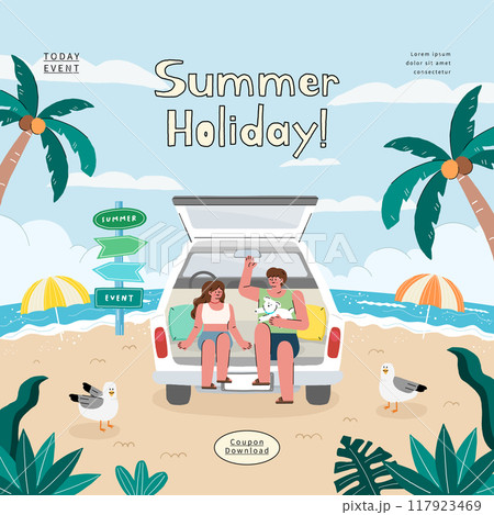 Blue summer tropical beach seamless pattern. Vector hand drawn palm tree, cute vacation story design