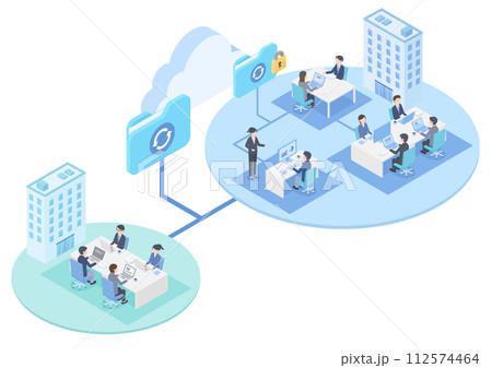 クラウド共有サービスを利用してリモートワークをしているアイソメトリックイラスト