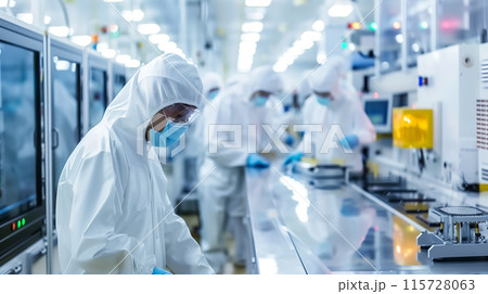 日本の半導体ラボで半導体部品を基板に配置するクリーンルーム専門家