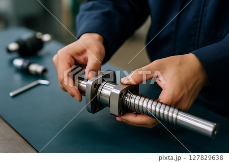 ボールねじとナットの組付け作業を行う技術者の手元