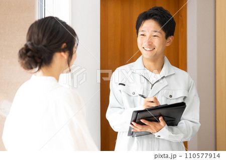 作業着姿のリフォーム・設備屋・工務店の男性と話を聞く主婦
