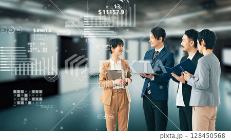 オフィスで会議する人々と統計グラフ