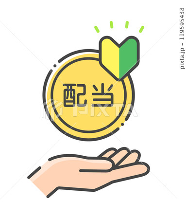 配当の文字と初心者マーク付きのコインを持つ人物の手のアイコン - 投資初心者が配当金をもらうイメージ