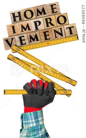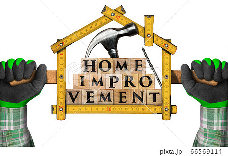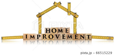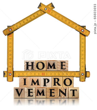 Folding ruler in the shape of a house and wooden text Home Improvement