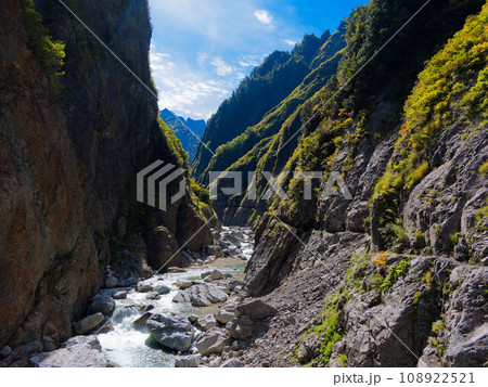 黒部渓谷下ノ廊下の紅葉と渓谷の写真