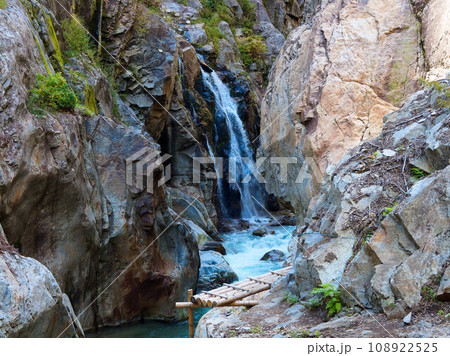 黒部渓谷下ノ廊下の断崖絶壁の道と滝の写真