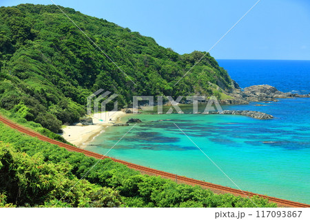 紺碧の折居海岸に沿って走る山陰本線を望む