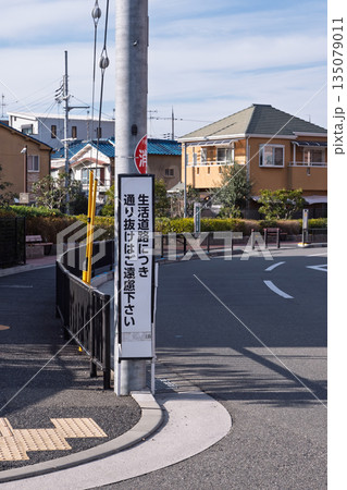 住宅街の電柱に設置された「生活道路につき通り抜けはご遠慮下さい」の注意看板と街並み