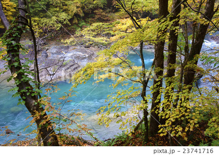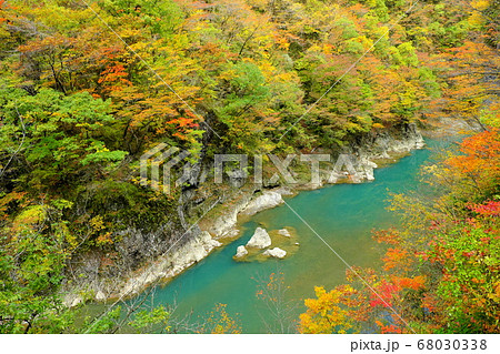 紅葉の田沢湖抱返り県立自然公園「抱返り渓谷」両岸の原生林に渓谷の美しいエメラルドグリーンが映える絶景