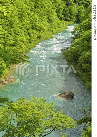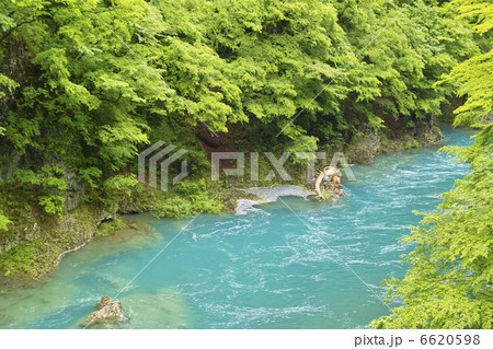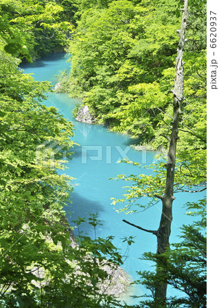 抱返渓谷 誓願橋から新緑に囲まれた青い水面と白い岩を望む 玉川 秋田県仙北市 春 昼間 横位置