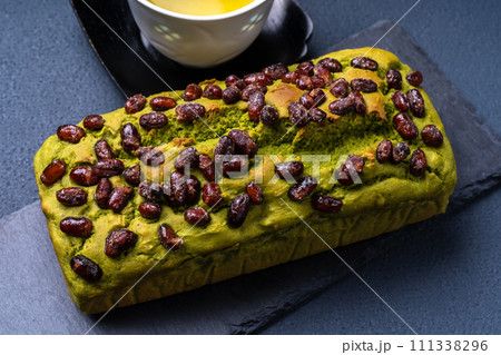 木の器に置かれた抹茶とあずきのパウンドケーキ