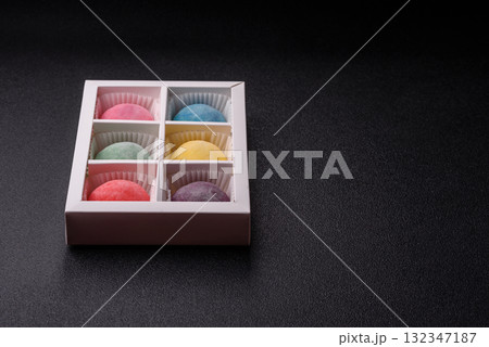 Japanese mochi, ice cream or Asian sweets with fruit filling. Mochi of different colors