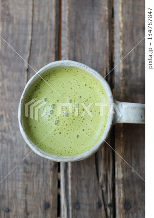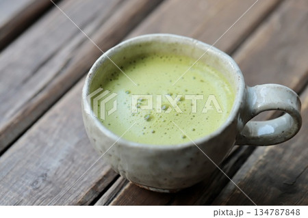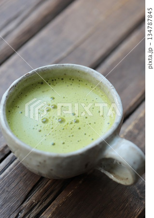 和食器のマグカップに入れた温かい抹茶オレ