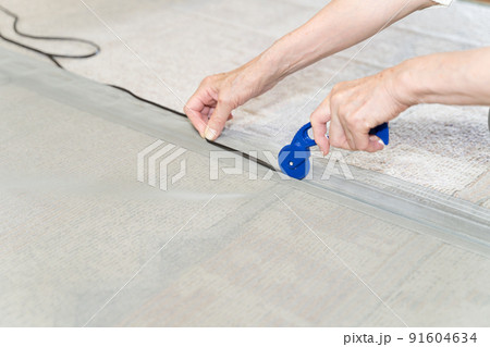 網戸の張り替え 防虫網を切って枠のコードをローラーで押し入れる