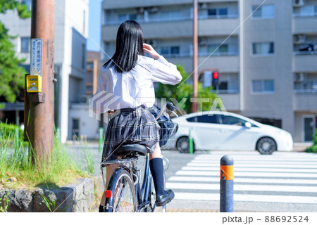 信号待ちする、自転車通学する女子高校生 後ろ姿 住宅地 市街地 綺麗な新緑