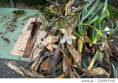 リュウゼツランの葉を押し切りで細かくする