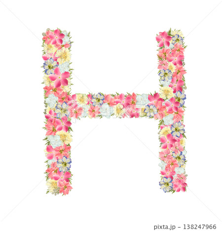 アルファベットのHの押し花素材 繊細なセリフ体 ピンクとブルーのボタニカル文字 背景透過PNG
