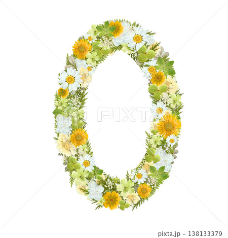 数字の0の押し花素材 黄色と白の花を敷き詰めたボタニカルナンバー 背景透過PNG